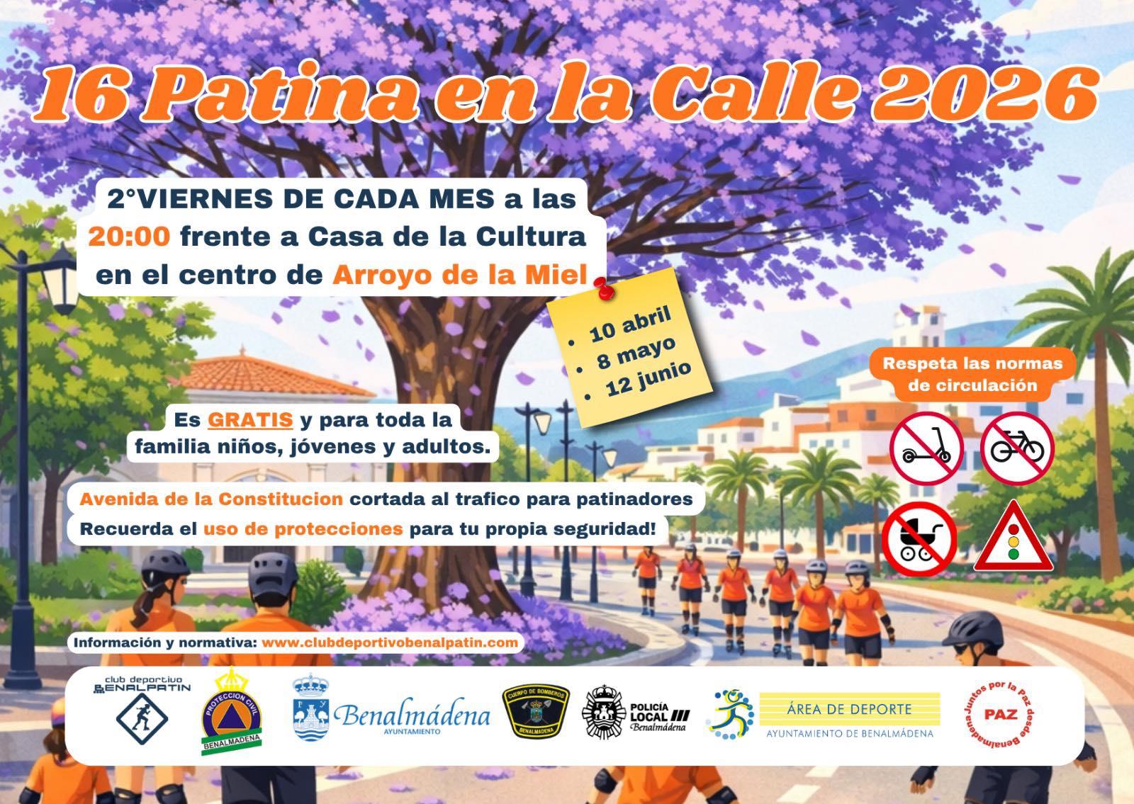 <p>Vuelve la actividad Patina en la Calle, se realizará los días 10 Abril, 8 Mayo y 12 Junio de 2026 a las 20:00 horas teniendo como punto de encuentro el frente de la Casa de la Cultura de Arroyo de la Miel (Benalmádena, Málaga) . Estos días se corta al tráfico de la Avenida Constitución y durante una hora solo podrán hacer uso de ella los patinadores. La actividad es gratuita.</p>